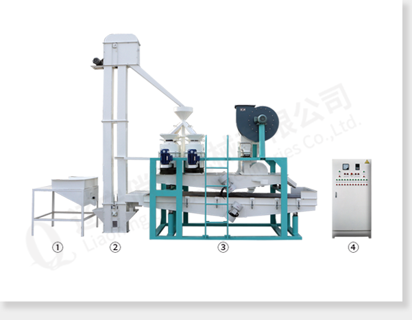 ①input hopper ②bucket elevator ③main part of the equipment(dehullers, air separator,and seed-kernel separator) ④electric control cabinet