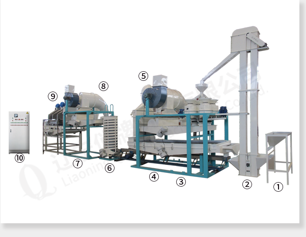 приёмный бункерковшовый элеваторглавная машина (шелушитель, вибросито для удаления шелухи и вибросито для сепарации нелущённой семечки и ядра)рессорный транспортёрвертикальное пневматическое устройство ⑥спиральный элеваторвибротранспортный ветросепаратор ⑧вертикальное пневматическое устройство ⑨электростатический ветросепаратор электрический управляющий шкаф