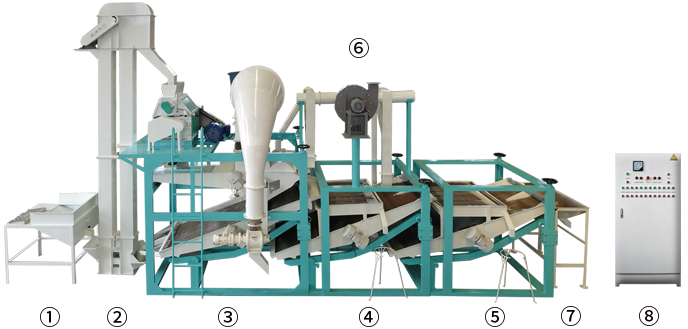 ①приёмный бункер②ковшовый элеватор③главная машина (шелушитель, вибросито для удаления шелухи и вибросито для сепарации нелущённой семечки и крупы)④машина для повторной сепарации нелущённой семечки и крупыⅠ  ⑤машина для повторной сепарации нелущённой семечки и крупыⅡ⑥пневматическое подъёмное устройство⑦бункер для сбора крупы⑧электрический управляющий шкаф